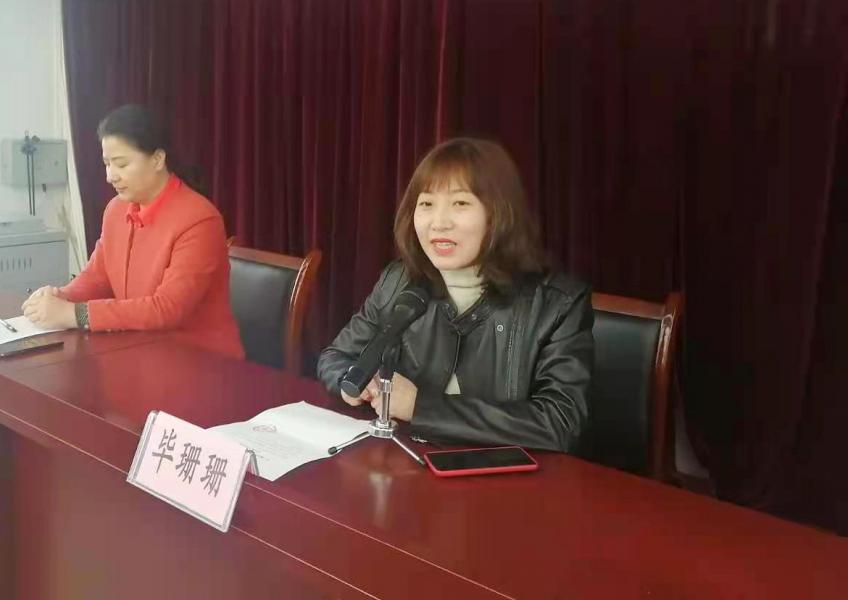 ? ? ? ?德城區(qū)新湖街道辦事處婦聯(lián)主席畢珊珊宣讀《關(guān)于同意成立德州陽光大姐家政服務(wù)有限公司婦女委員會的批復(fù)》。